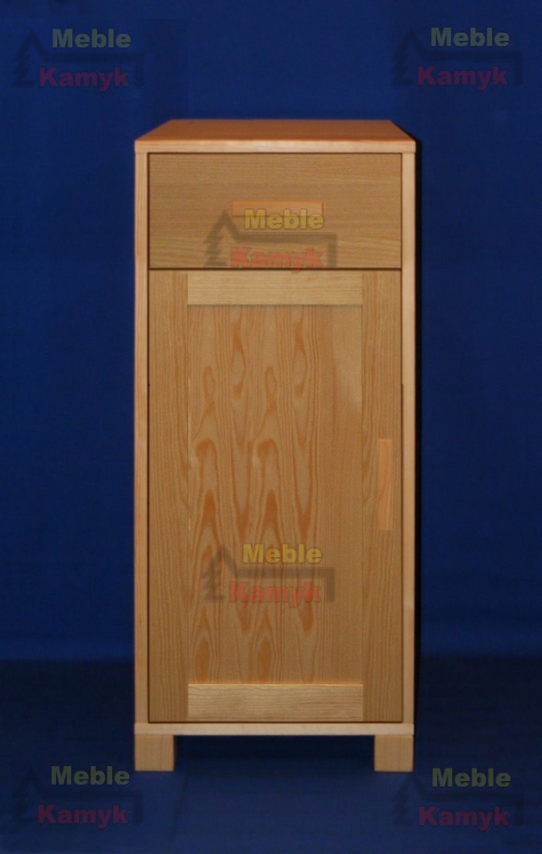 Komoda Sylwia A-5/2 z szufladą i drzwiami za którymi znajdują się trzy półki (wnęki). Dostępna w czterech gatunkach drewna: sosnowego, olchowego, bukowego lub dębowego.