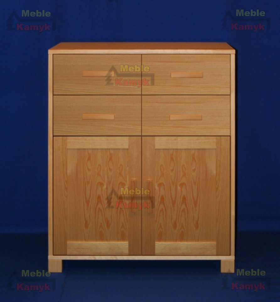 Komoda Sylwia B-5/5 z czterema małymi szufladami i podwójnymi drzwiami, za którymi znajdują się dwie półki (wnęki). Przestrzeń za drzwiami dzielona pionową przegrodą.
