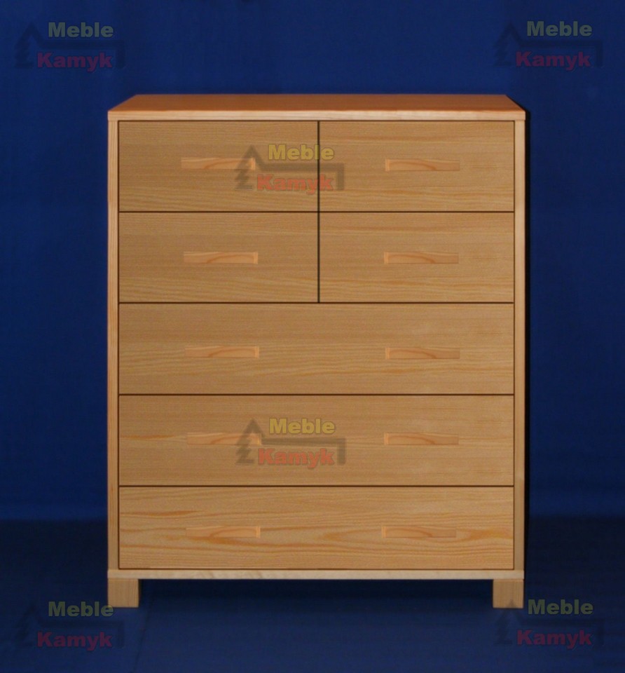 Komoda Sylwia B-5/6 z czterema małymi i trzema dużymi. Dostępna w czterech gatunkach drewna: sosnowego, olchowego, bukowego lub dębowego.