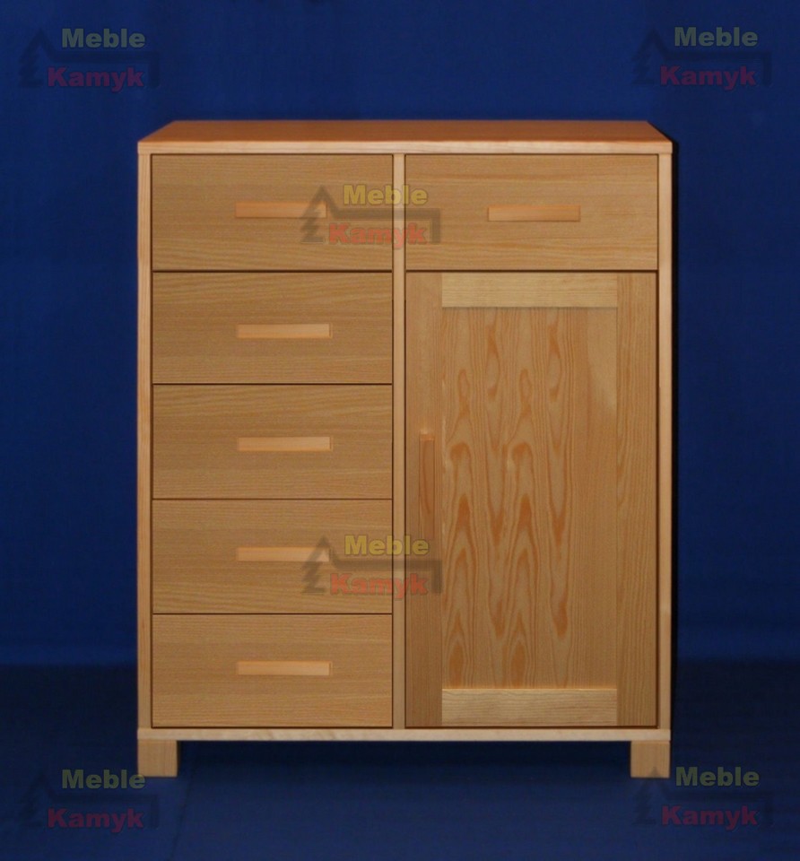 Komoda Sylwia B-5/8 z sześcioma małymi szufladami i drzwiami, za którymi znajdują się trzy półki (wnęki). Dostępna w czterech gatunkach drewna: sosnowego, olchowego, bukowego lub dębowego.