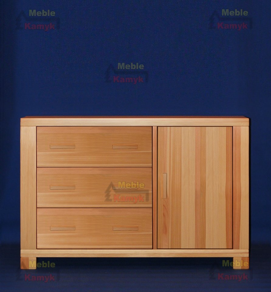 Komoda Tina J-3/2 z trzema dużymi szufladami i drzwiami za którymi znajdują się dwie półki (wnęki).