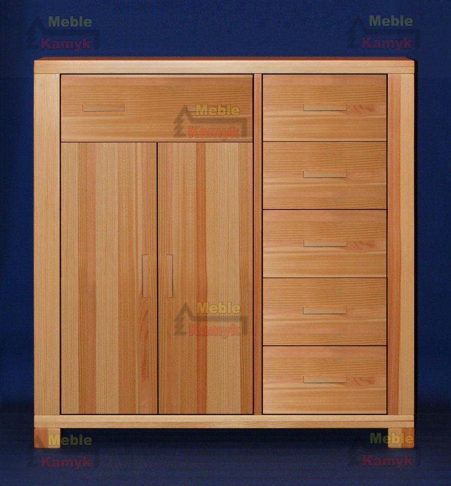 Komoda Tina J-5/5 z pięcioma małymi i jedną dużą szufladą, oraz podwójnymi drzwiami, za którymi znajdują się trzy półki (wnęki).