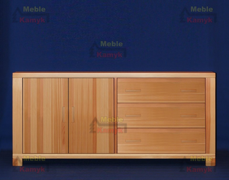 Nowoczesna komoda z drewna Tina L-3/2 wykonana jest w układzie pół na pół, czyli po jednej stronie znajdziemy wnękę z podwójnymi drzwiami, a po drugiej trzy duże szuflady. Wszystkie jej elementy wykonane są z litego drewna w pierwszej klasie jakości, za wyjątkiem pleców komody i spodów szuflad.Cechą charakterystyczną tego mebla są pogrubione blaty i poszerzone boki, które mają odpowiednio 4cm i 8cm szerokości. Komoda ta należy do rodziny mebli z linii wzorniczej Tina, której bogactwo rodzajów mebli, układów i dostępna kolorystyka, pozwala umeblować kompleksowo każde pomieszczenie w mieszkaniu.
