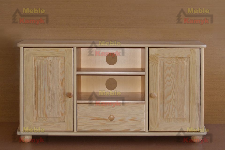 Stolik Klasyczny RTV 3-10 z dwiema wnękami, dwojgiem drzwi i szufladą. Dostępny w szerokościach 122, 142cm, oraz w czterech gatunkach drewna: sosnowego, olchowego, bukowego lub dębowego. Inne gatunki drewna i nietypowe rozmiary mebli na zamówienie klienta. Wersje Stolików RTV: - na cokole lub na kulach,