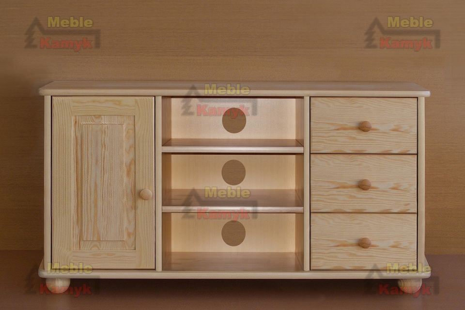 Stolik Klasyczny RTV 3-9 z trzema wnękami, drzwiami i trzema szufladami. Dostępny w szerokościach 122, 142cm, oraz w czterech gatunkach drewna: sosnowego, olchowego, bukowego lub dębowego. Inne gatunki drewna i nietypowe rozmiary mebli na zamówienie klienta. Wersje Stolików RTV: - na cokole lub na kulach,