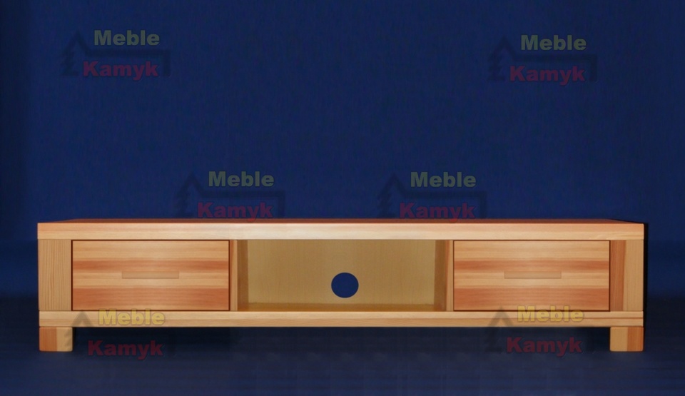 Stolik Tina RTV 1-6 z wnęką i dwiema szufladami. Dostępny w szerokościach 110, 130, 150 cm, oraz w czterech gatunkach drewna: sosnowego, olchowego, bukowego lub dębowego. Inne gatunki drewna i nietypowe rozmiary mebli na zamówienie klienta.