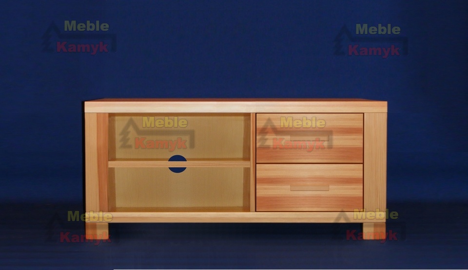 Stolik Tina RTV 2-3 z dwiema wnękami i szufladami. Dostępny w szerokościach 88, 98, 118 cm, oraz w czterech gatunkach drewna: sosnowego, olchowego, bukowego lub dębowego. Inne gatunki drewna i nietypowe rozmiary mebli na zamówienie klienta.