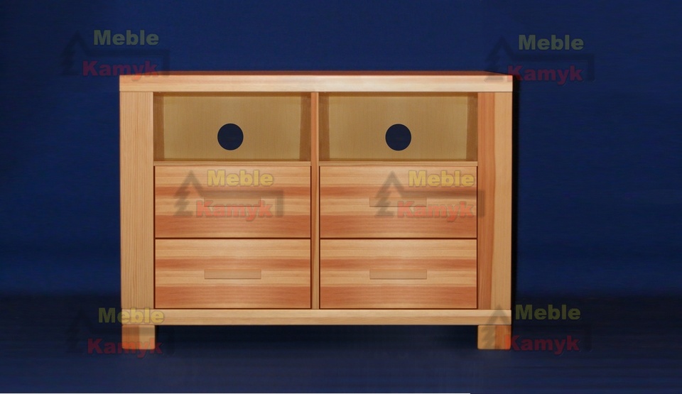 Stolik Tina RTV 3-5 z dwiema wnękami i czterema szufladami o szerokości 118 cm, oraz w czterech gatunkach drewna: sosnowego, olchowego, bukowego lub dębowego. Inne gatunki drewna i nietypowe rozmiary mebli na zamówienie klienta.