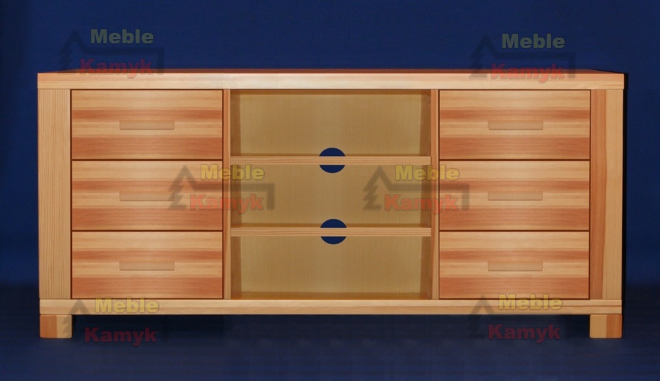 Stolik Tina RTV 3-6 z trzema wnękami i sześcioma szufladami. Dostępny w szerokościach 110, 130, 150 cm, oraz w czterech gatunkach drewna: sosnowego, olchowego, bukowego lub dębowego. Inne gatunki drewna i nietypowe rozmiary mebli na zamówienie klienta.