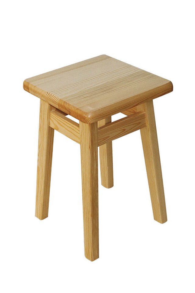 Taboret sosnowy lakierowany o klasycznym wyglądzie, który posiada kwadratowe siedzisko z lekko rozchylonymi nogami